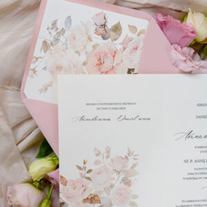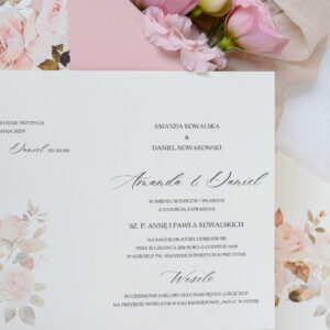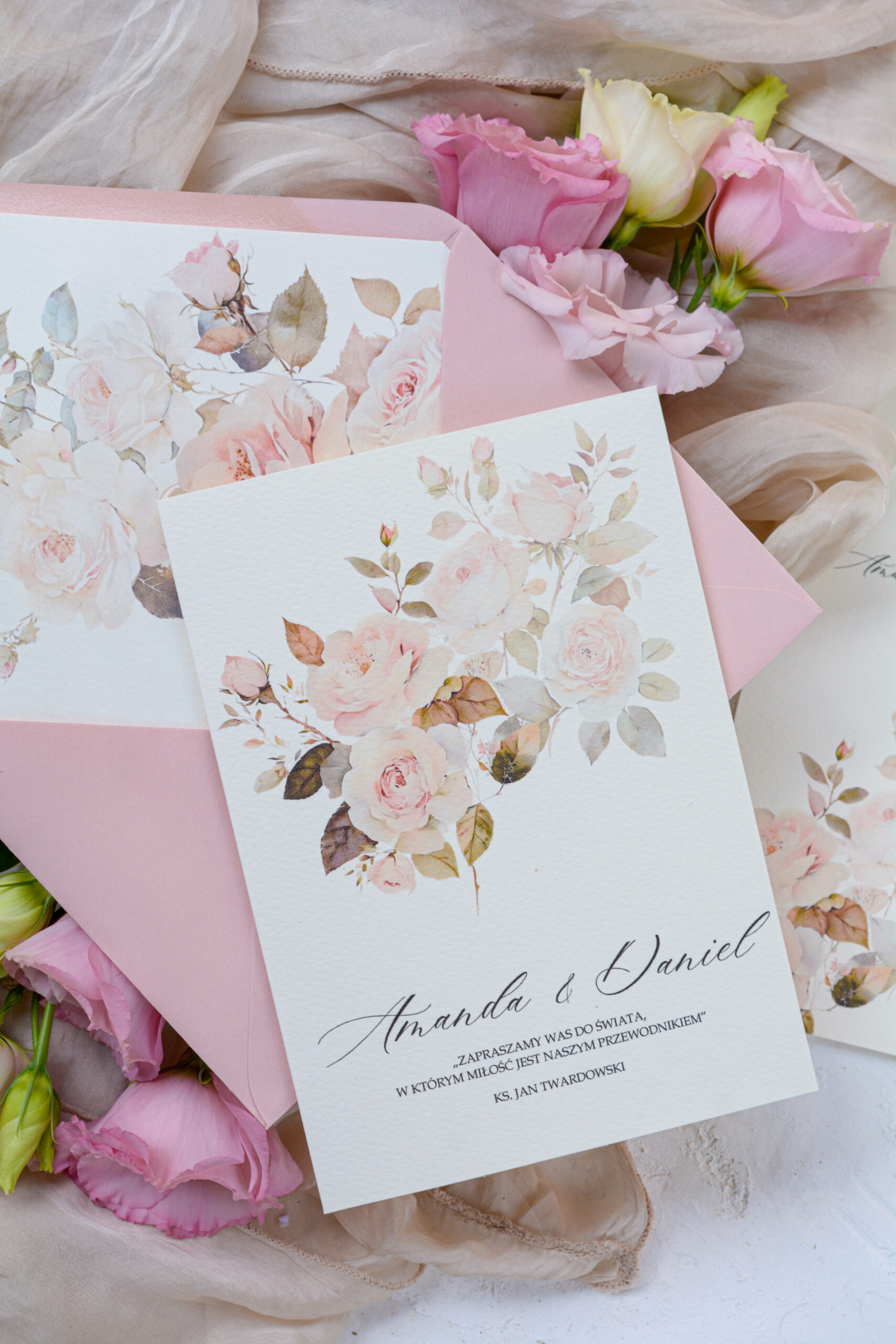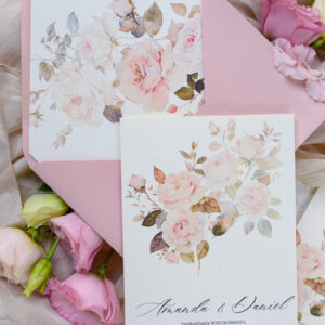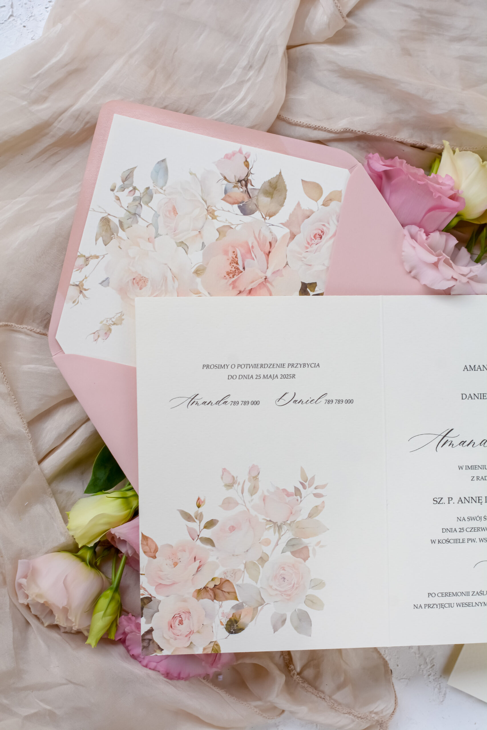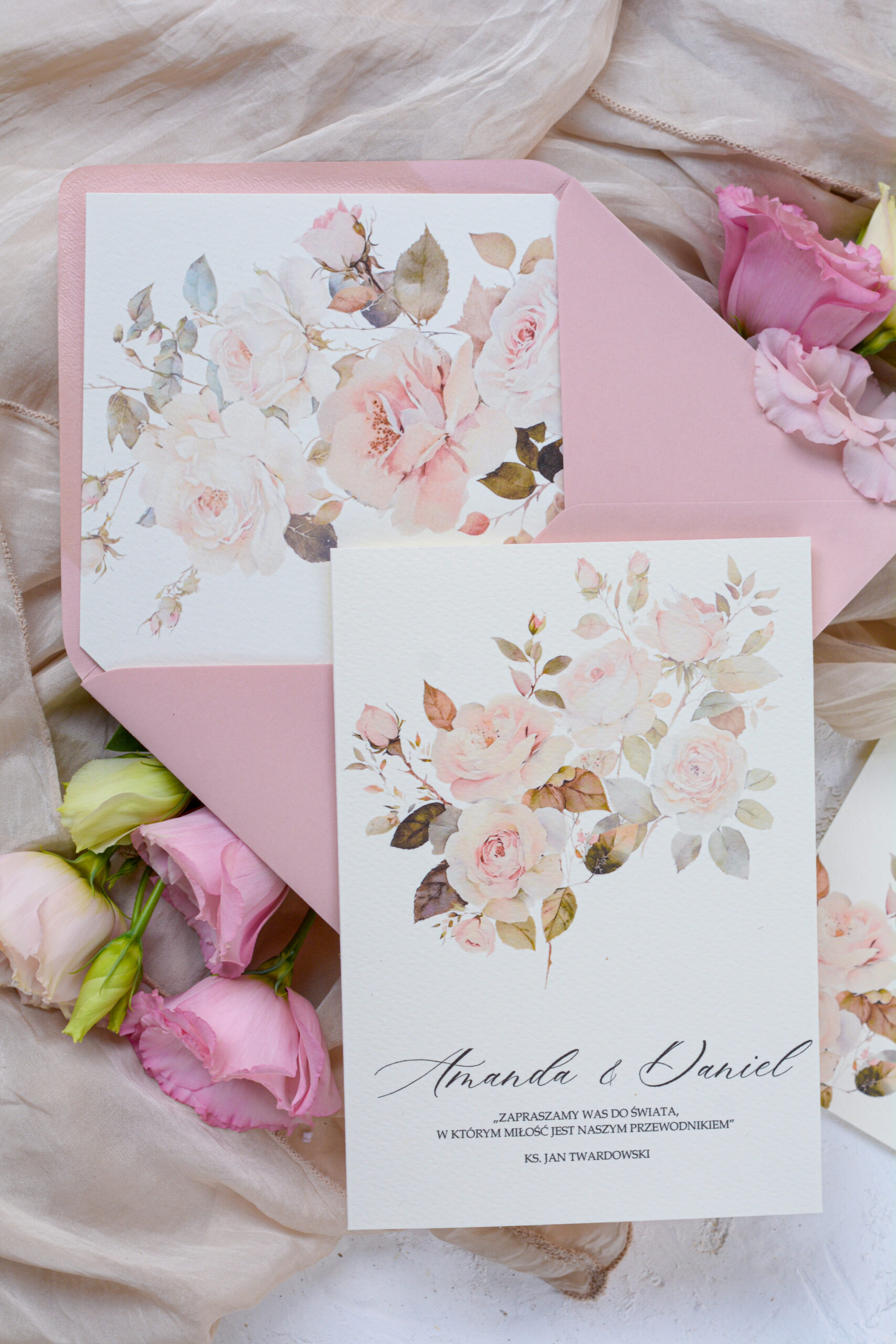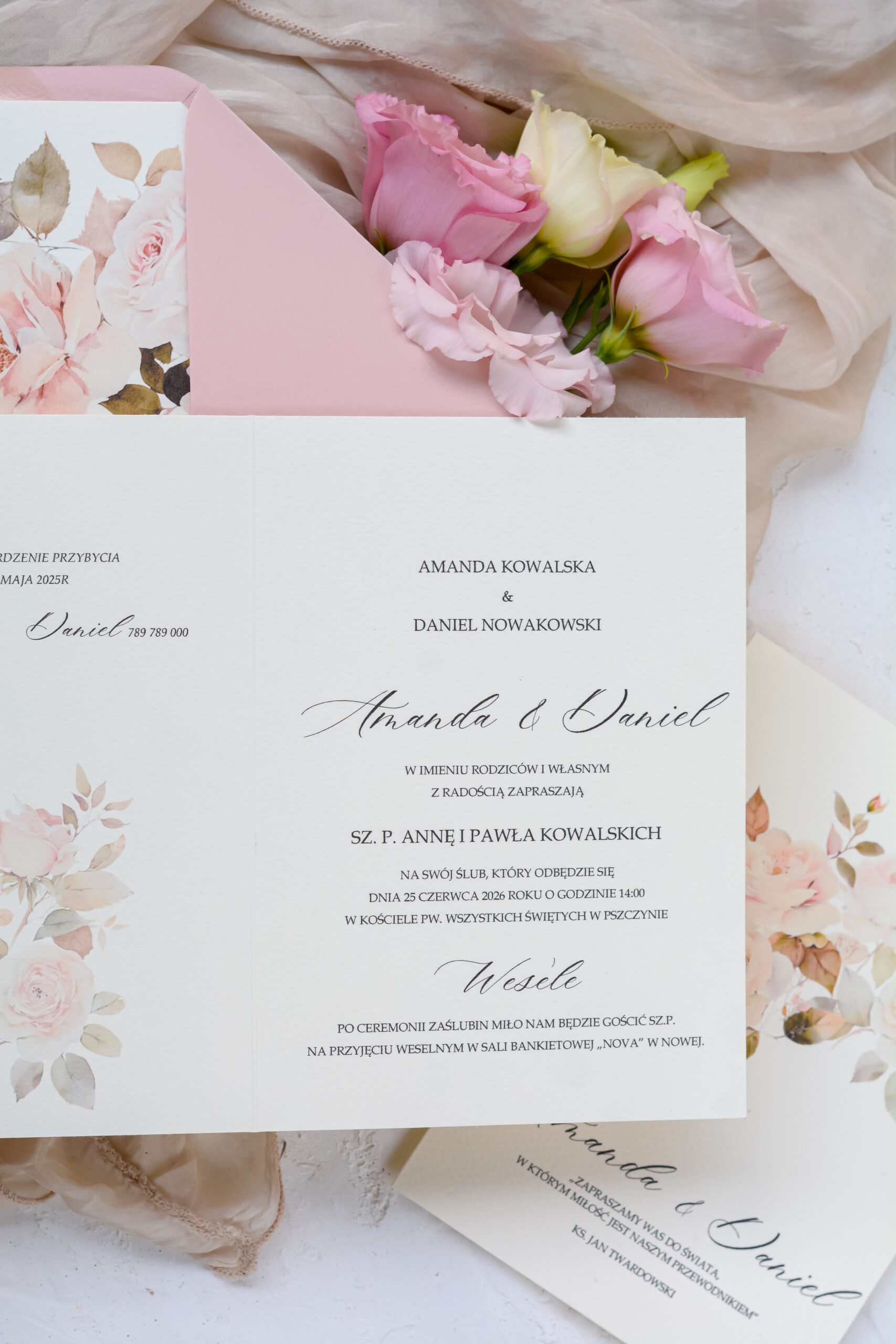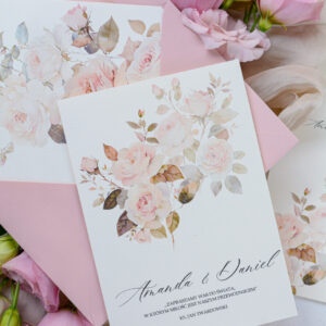 Różowe zaproszenia na ślub z motywem kwiatowym Wz-164