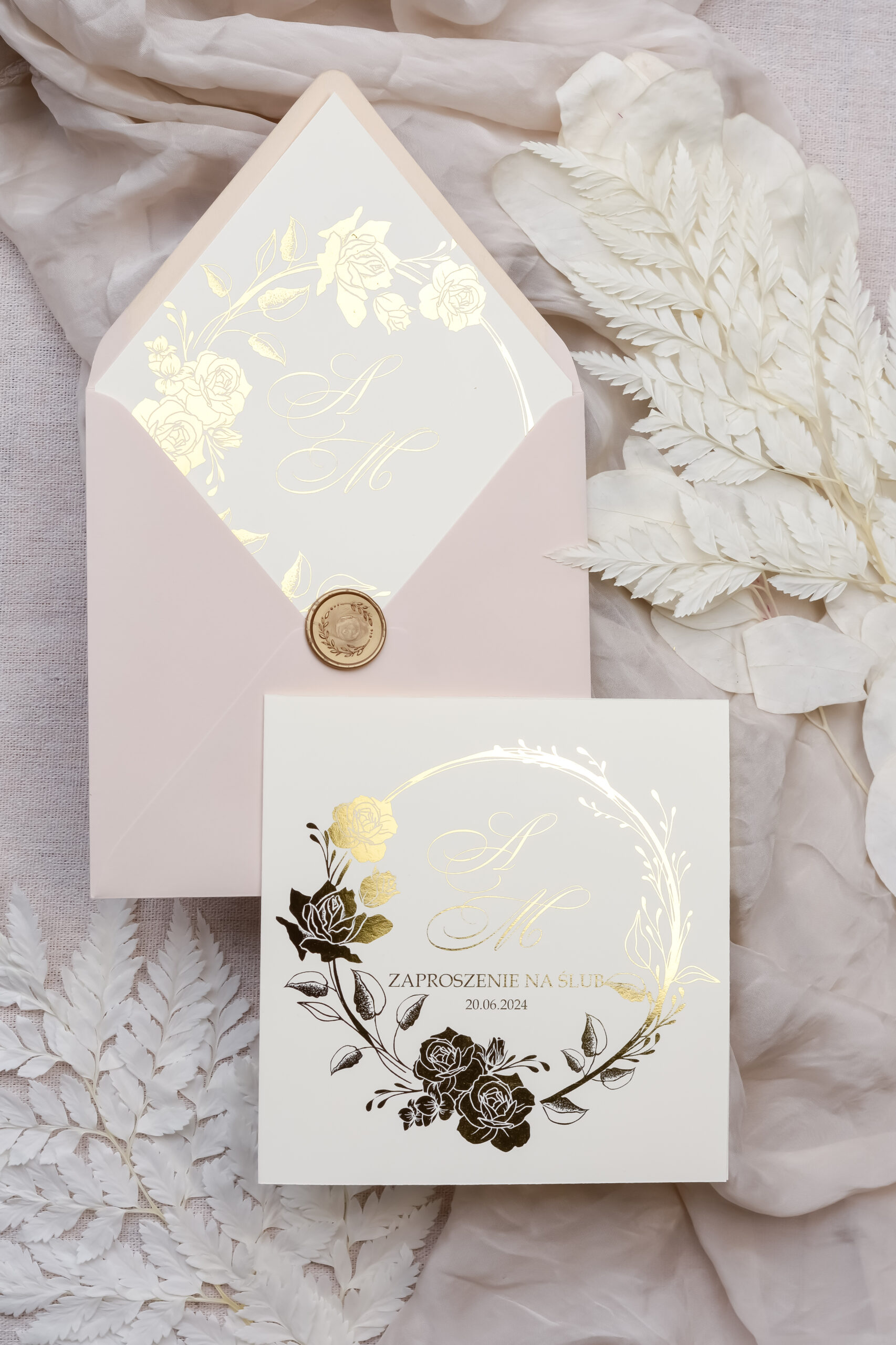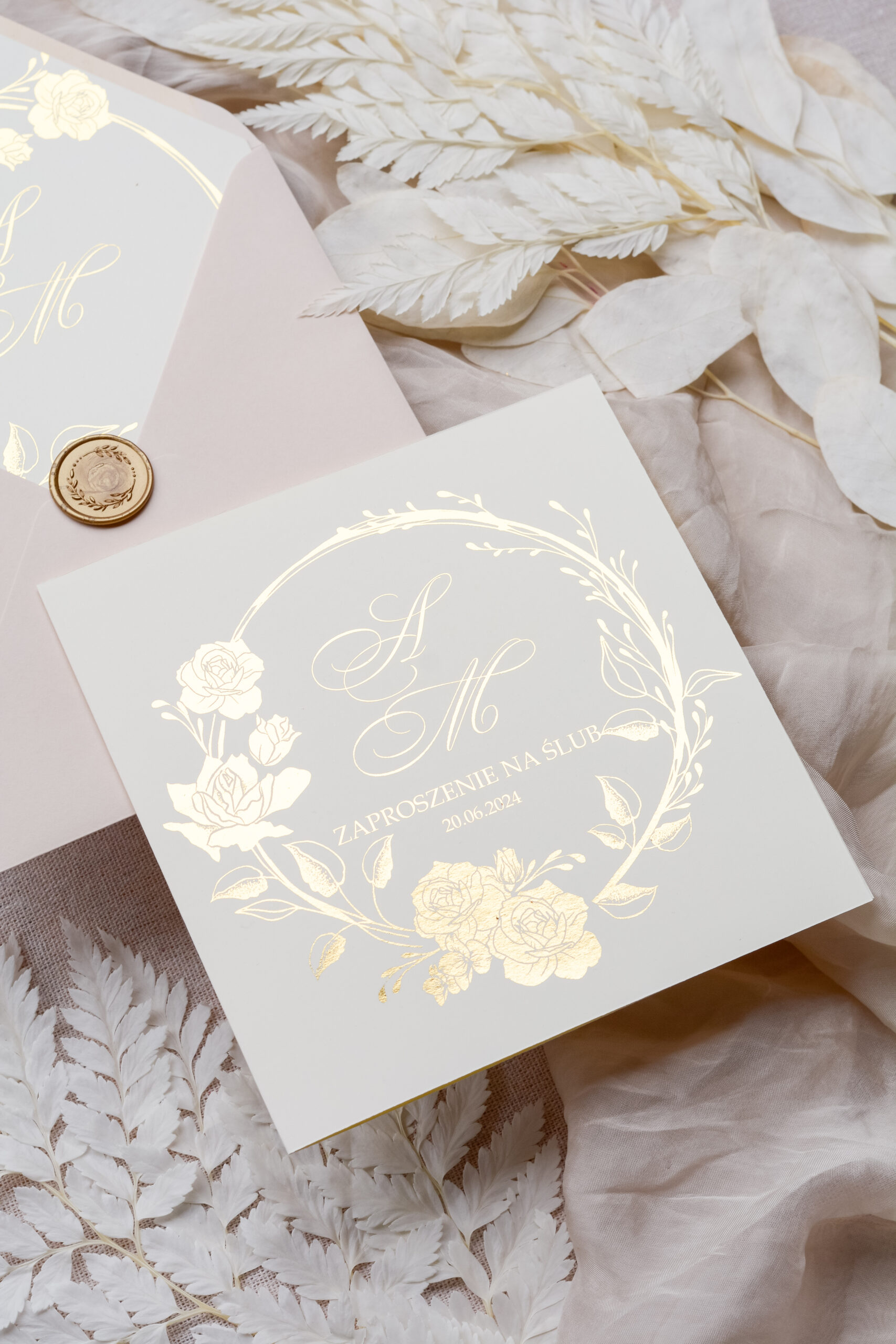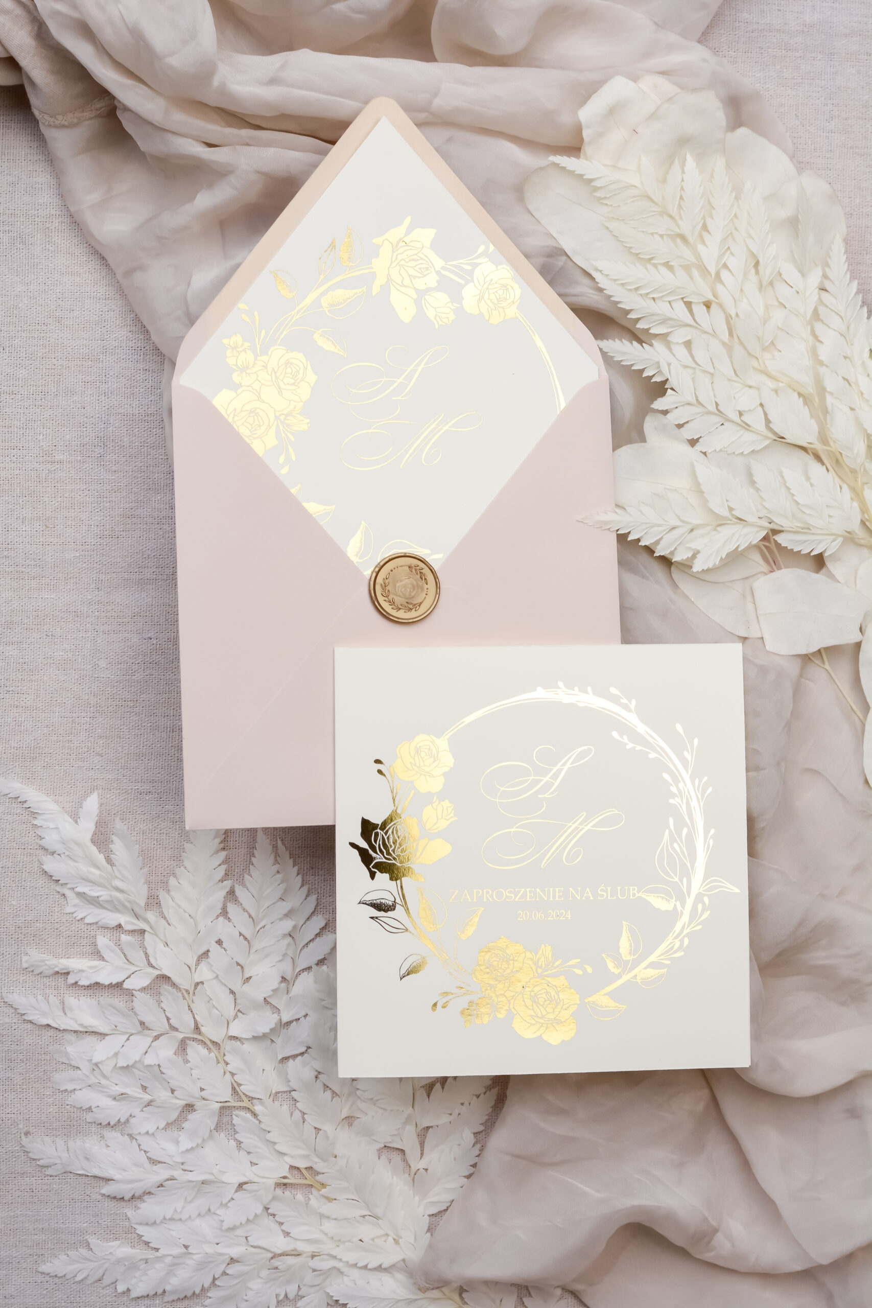 Złocone zaproszenia ślubne z motywem kwiatowym Wz-95