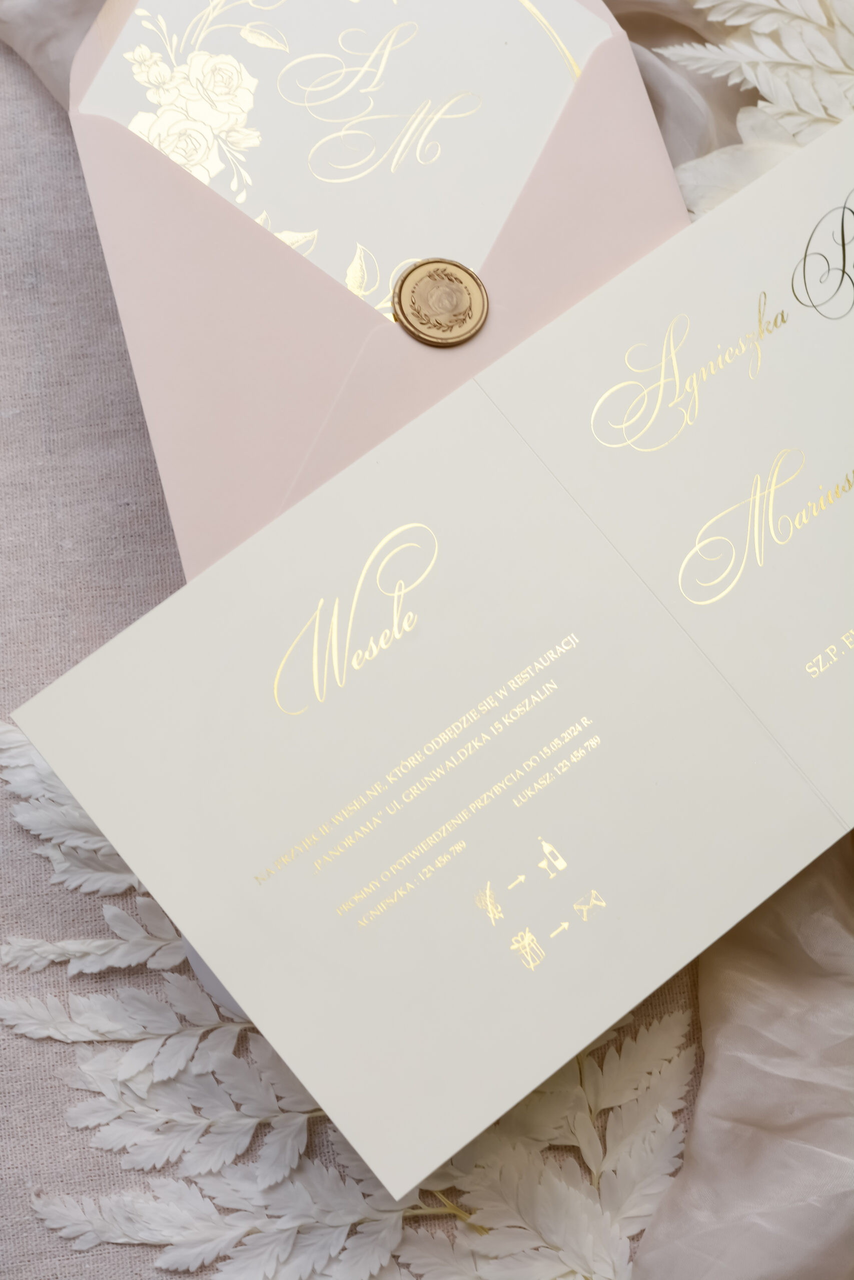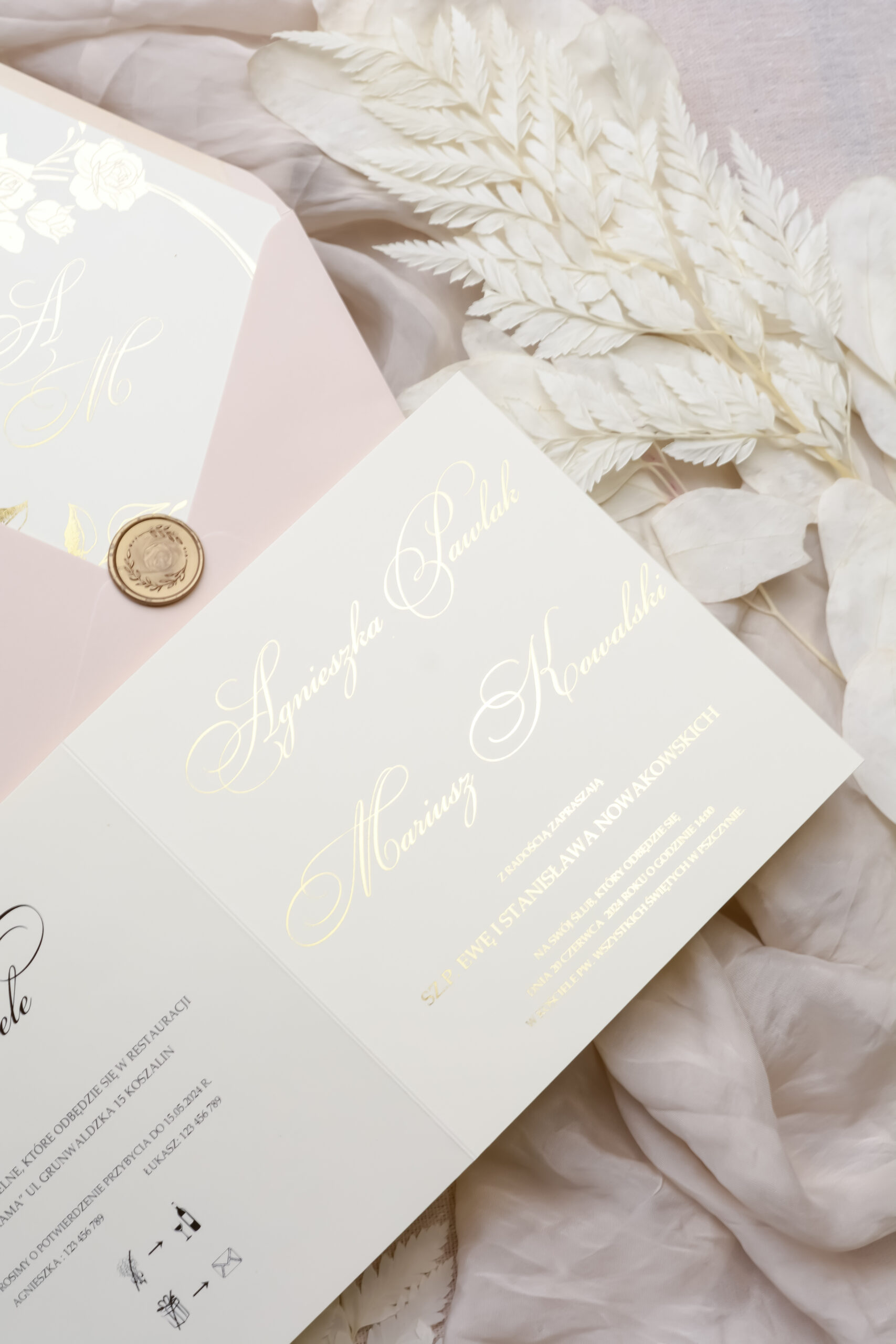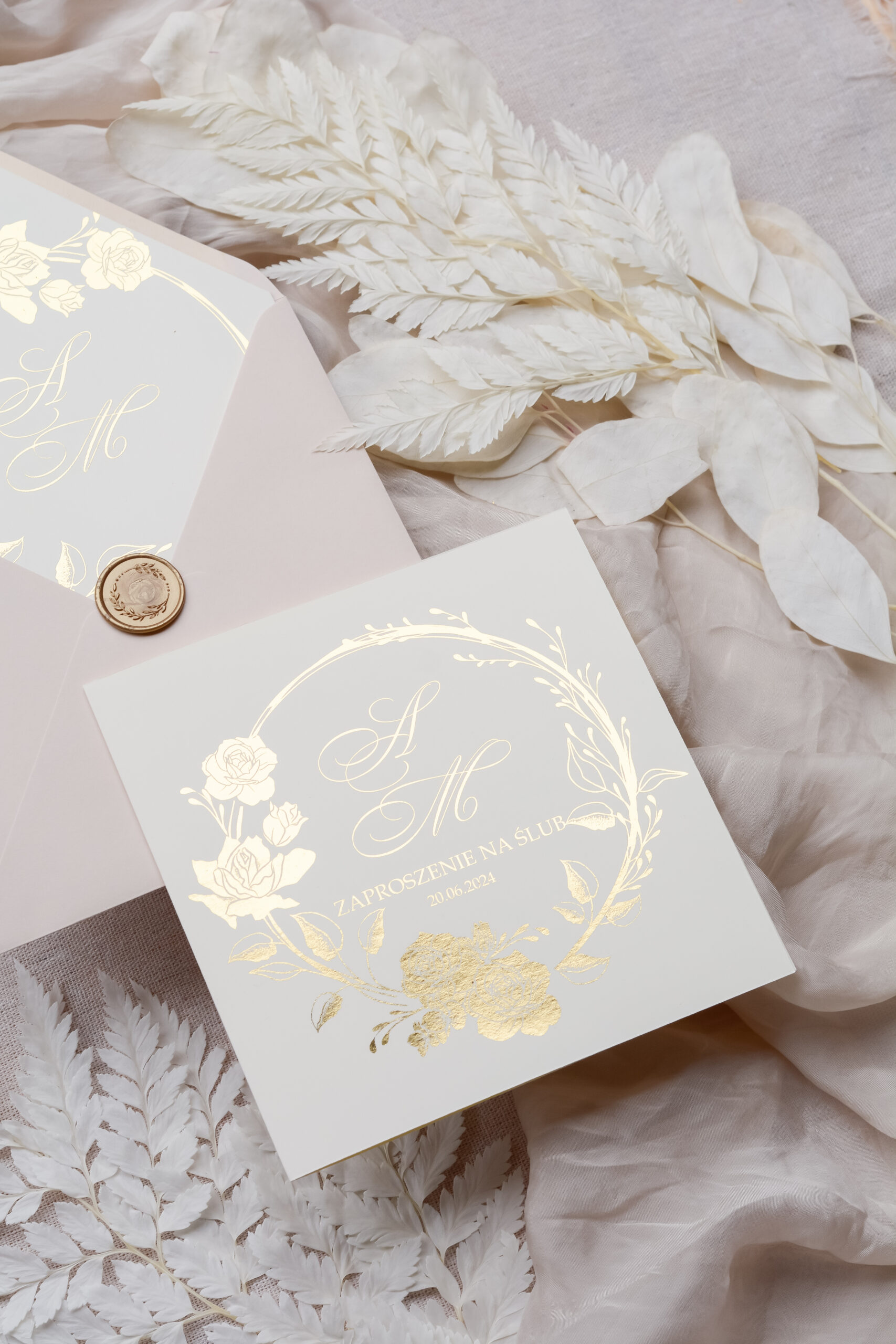 Złocone zaproszenia ślubne z motywem kwiatowym Wz-95